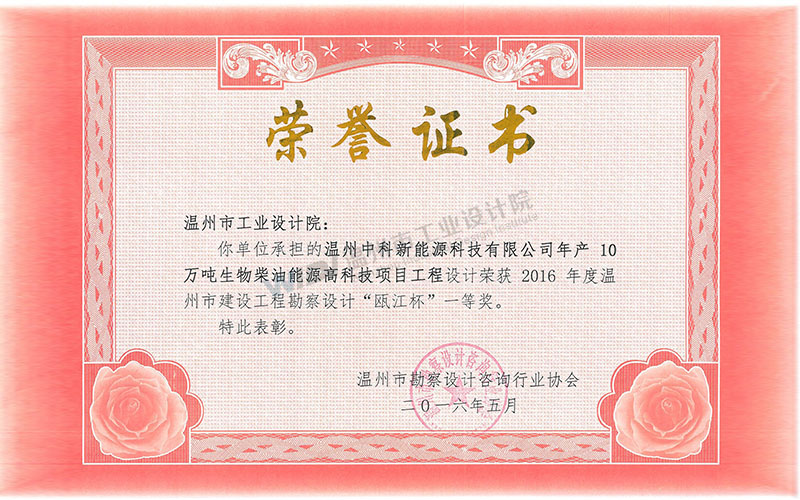 溫州中科新能源科技有限公司年產(chǎn)10萬噸生物柴油能源高科技項目 甌江杯一等獎
