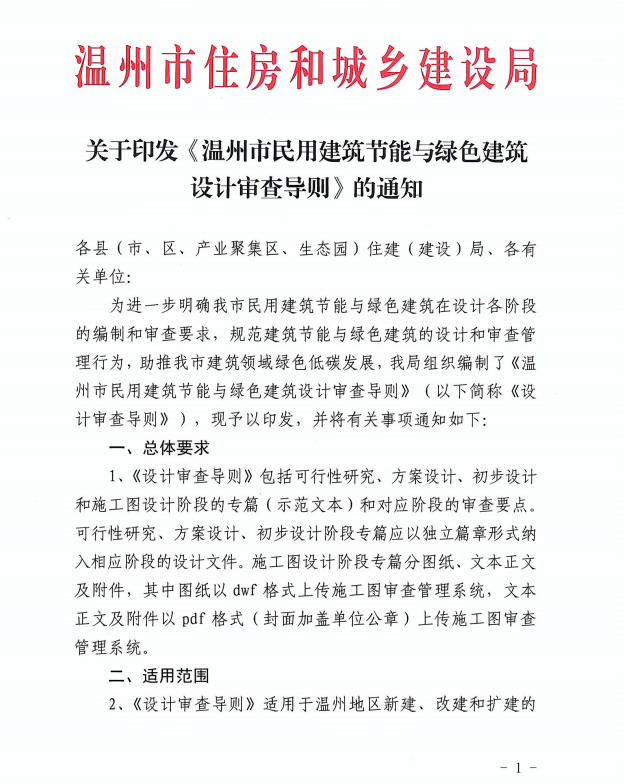 2022年7月15日,溫州市住房和城鄉(xiāng)建設(shè)局印發(fā)由工業(yè)院負(fù)責(zé)編制的《溫州市民用建筑節(jié)能與綠色建筑設(shè)計審查導(dǎo)則》,并將從8月15日起施行,標(biāo)志著溫州市綠色建筑設(shè)計進(jìn)入新的階段。